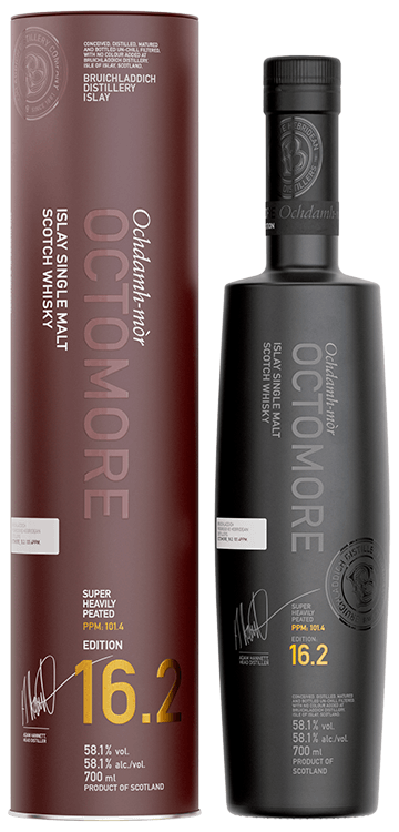 Bruichladdich Octomore 16.2 58.1% 700ml takes the Octomore DNA and layers in a more complex cask regime. Where 16.1 shows the spirit in ex-bourbon, 16.2 steps into a mix of barrel types (including wine or fortified influence in the series concept) to add darker fruit, spice and texture around that famously intense peat smoke.