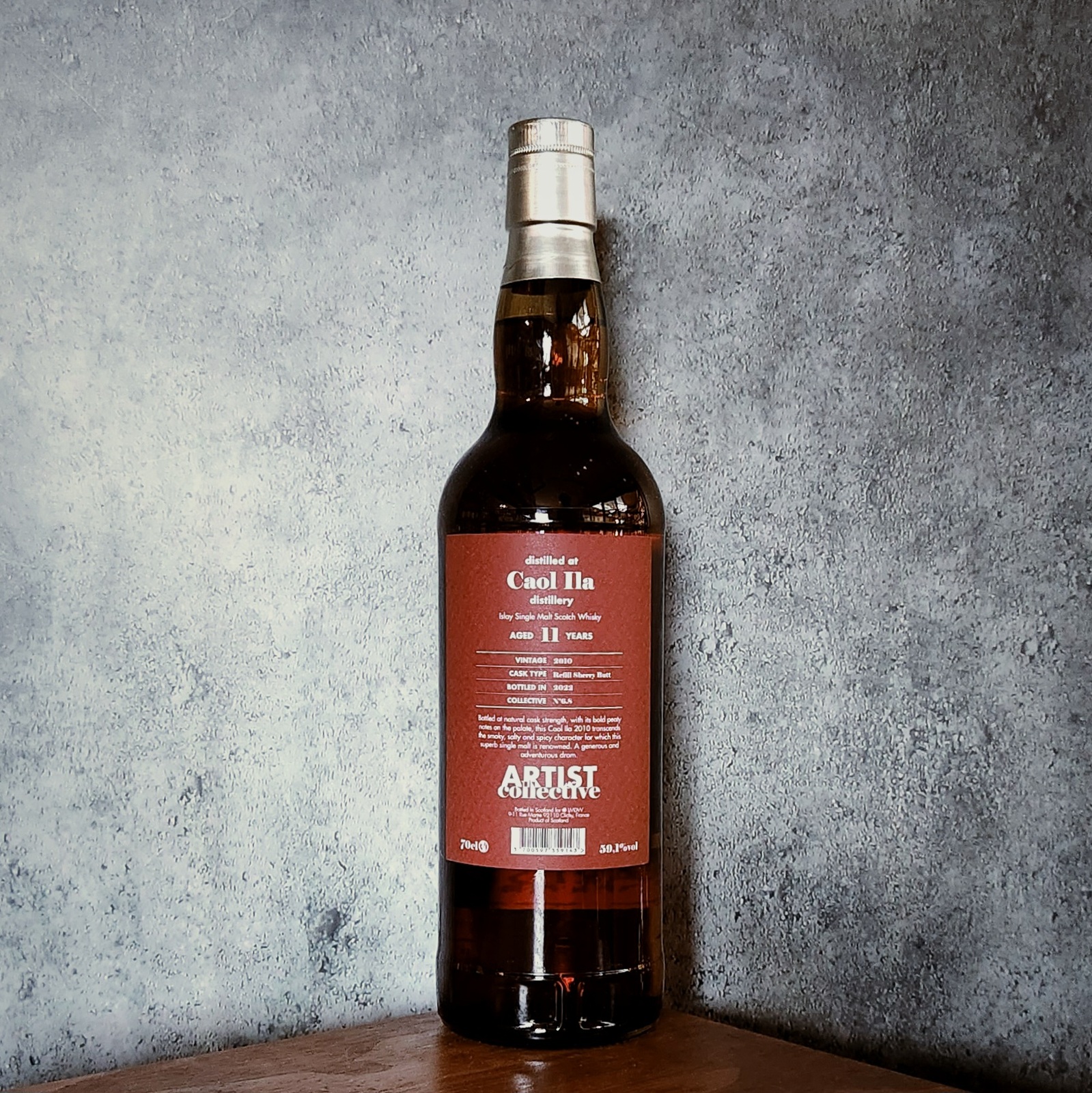 This Caol Ila 11 years old was distilled in 2010 and bottled in 2022, having spent its maturation period in a refill sherry butt. The whisky was bottled at cask strength, resulting in a high alcohol content of 59.1%. This particular expression showcases the distillery's signature peaty and spicy character, balanced by the influence of the refill sherry cask.